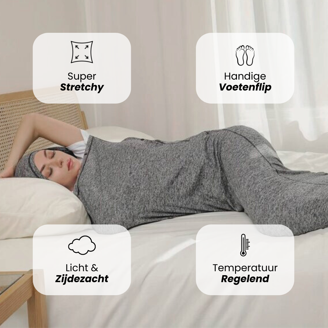 Waar verzwaringsdekens vooral lokaal druk geven, biedt de Comfy's stretchy bag een gelijkmatige, lichte compressie over je hele lichaam – zonder warmte op te hopen. De ademende, rekbare rayonstof voelt koel en zijdezacht aan.